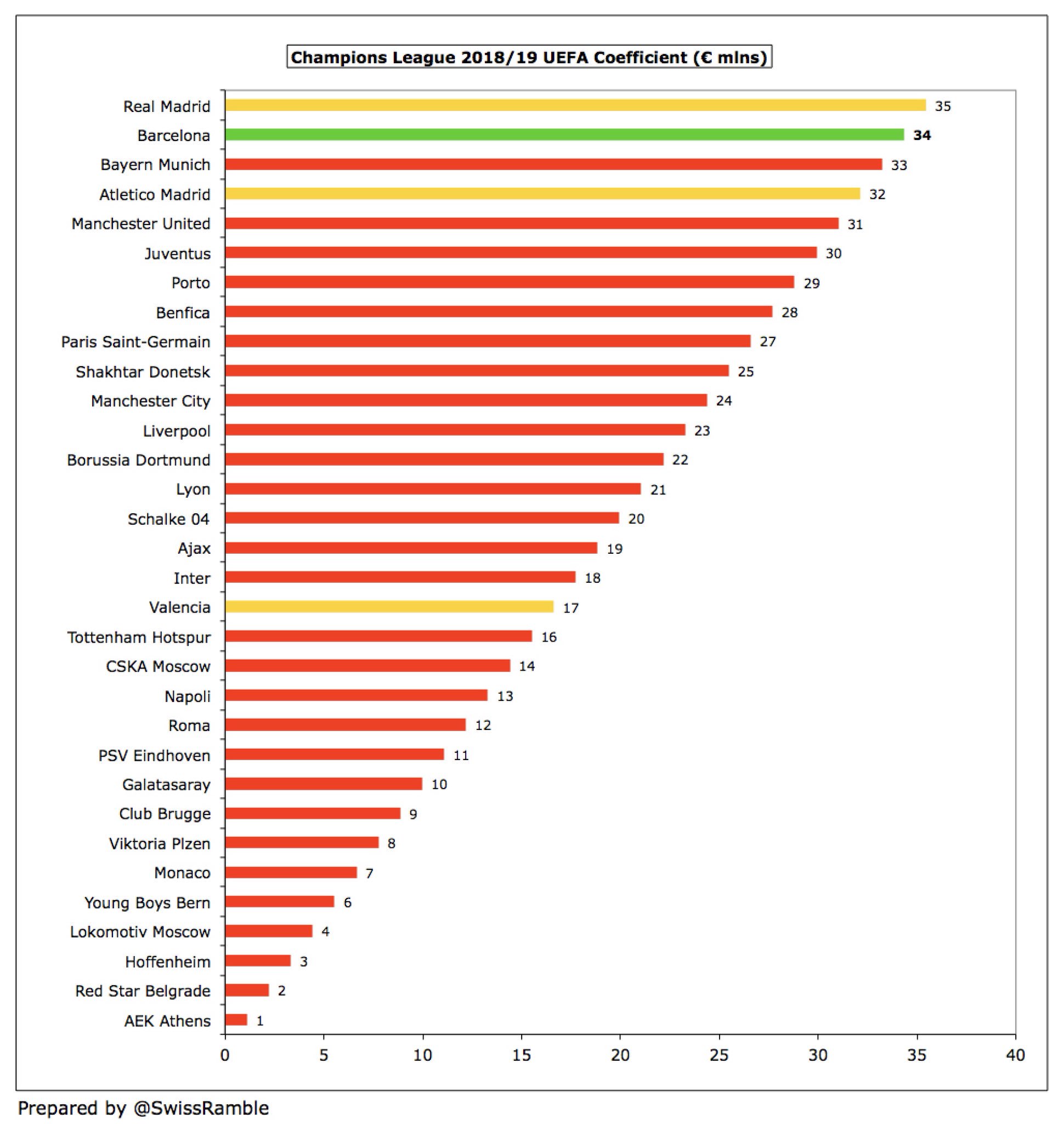 בעונת 2017/18, ברצלונה קיבלה 57 מ' על הגעה לרבע גמר ליגת האלופות – 3 מ' פחות מהעונה הקודמת. בהשוואה למועדונים אחרים: ריאל מדריד – 89 מ' (זכייה בליגת האלופות), סביליה – 48 מ', אתלטיקו מדריד – 48 מ' (זכייה בליגה האירופית).