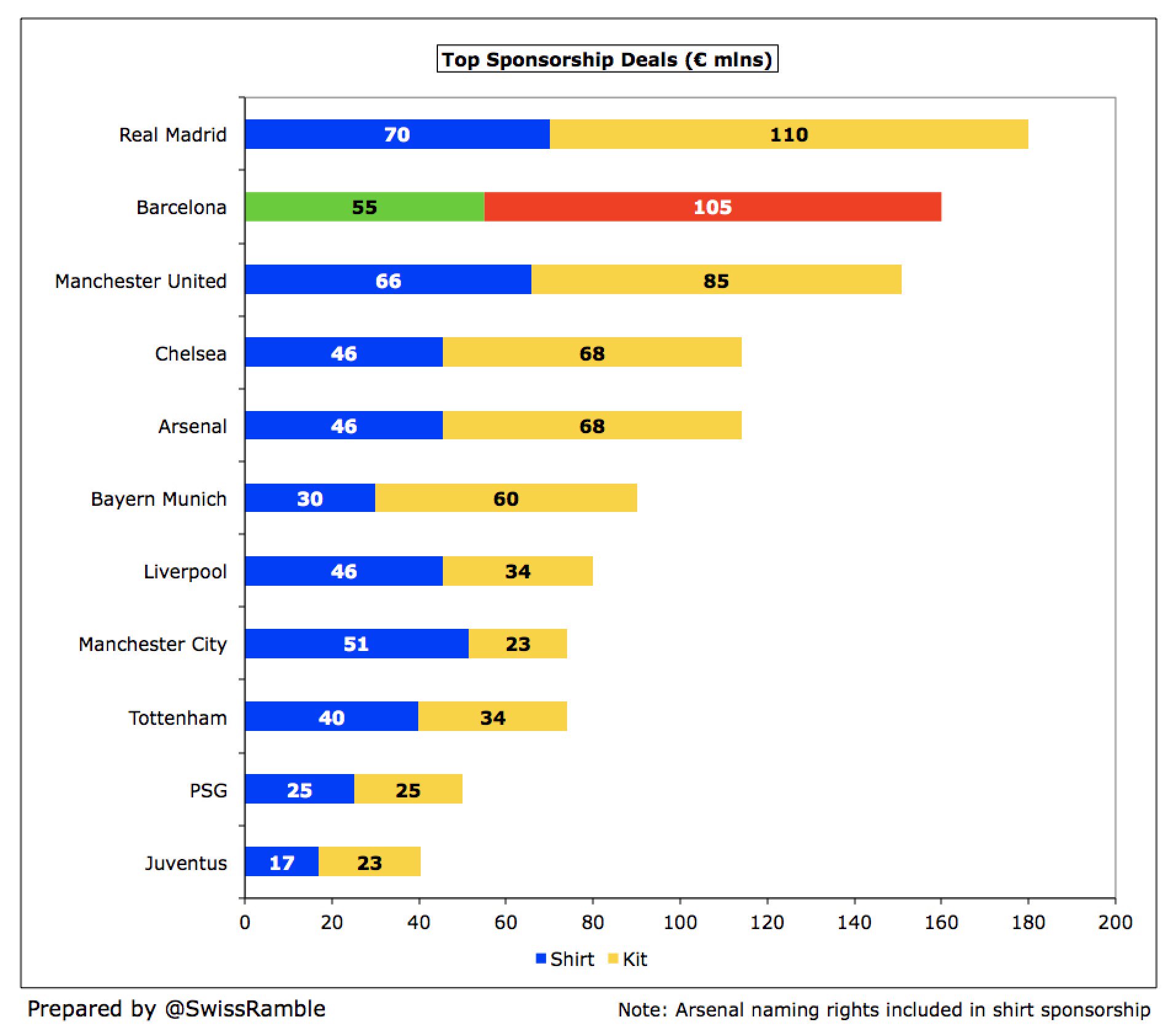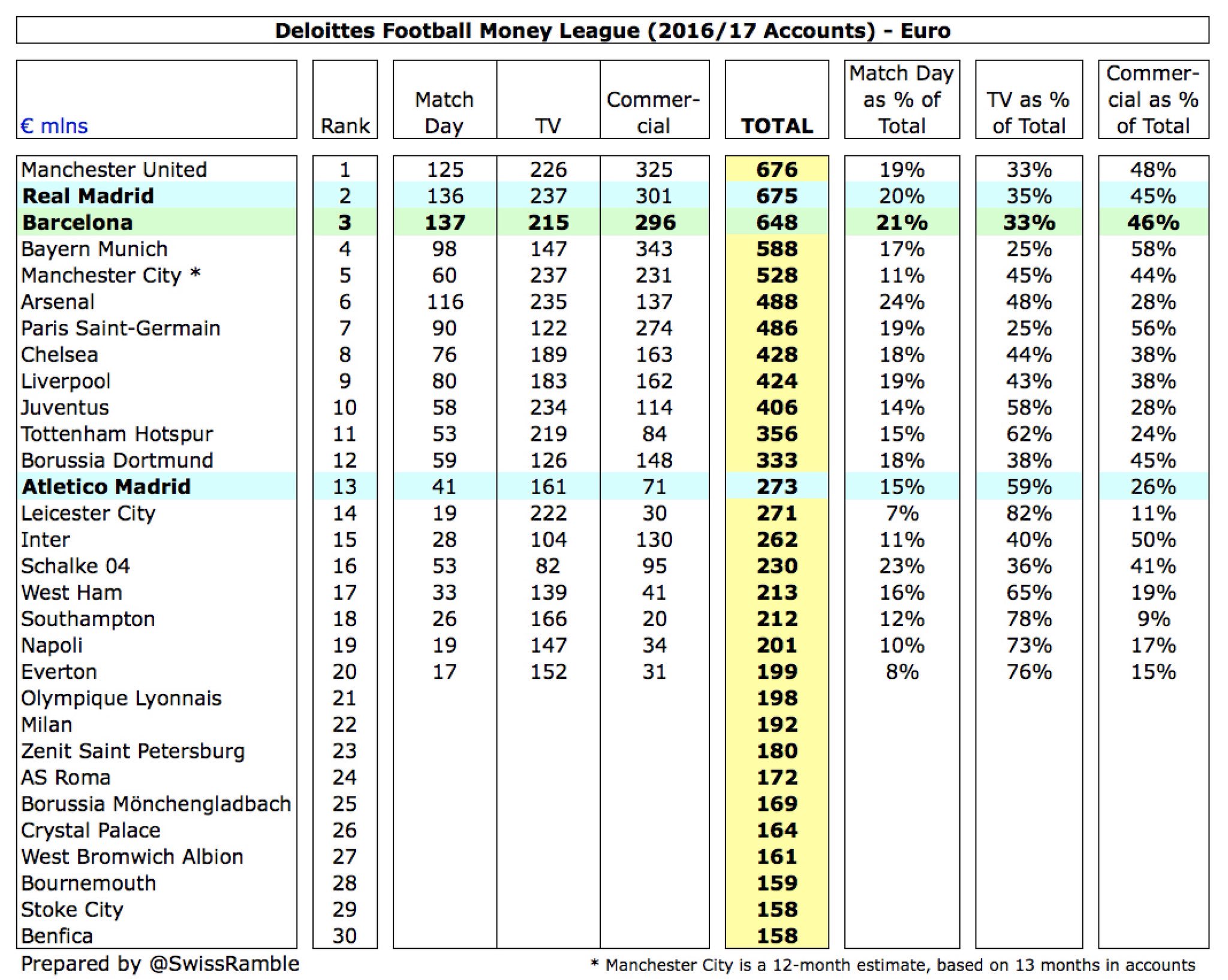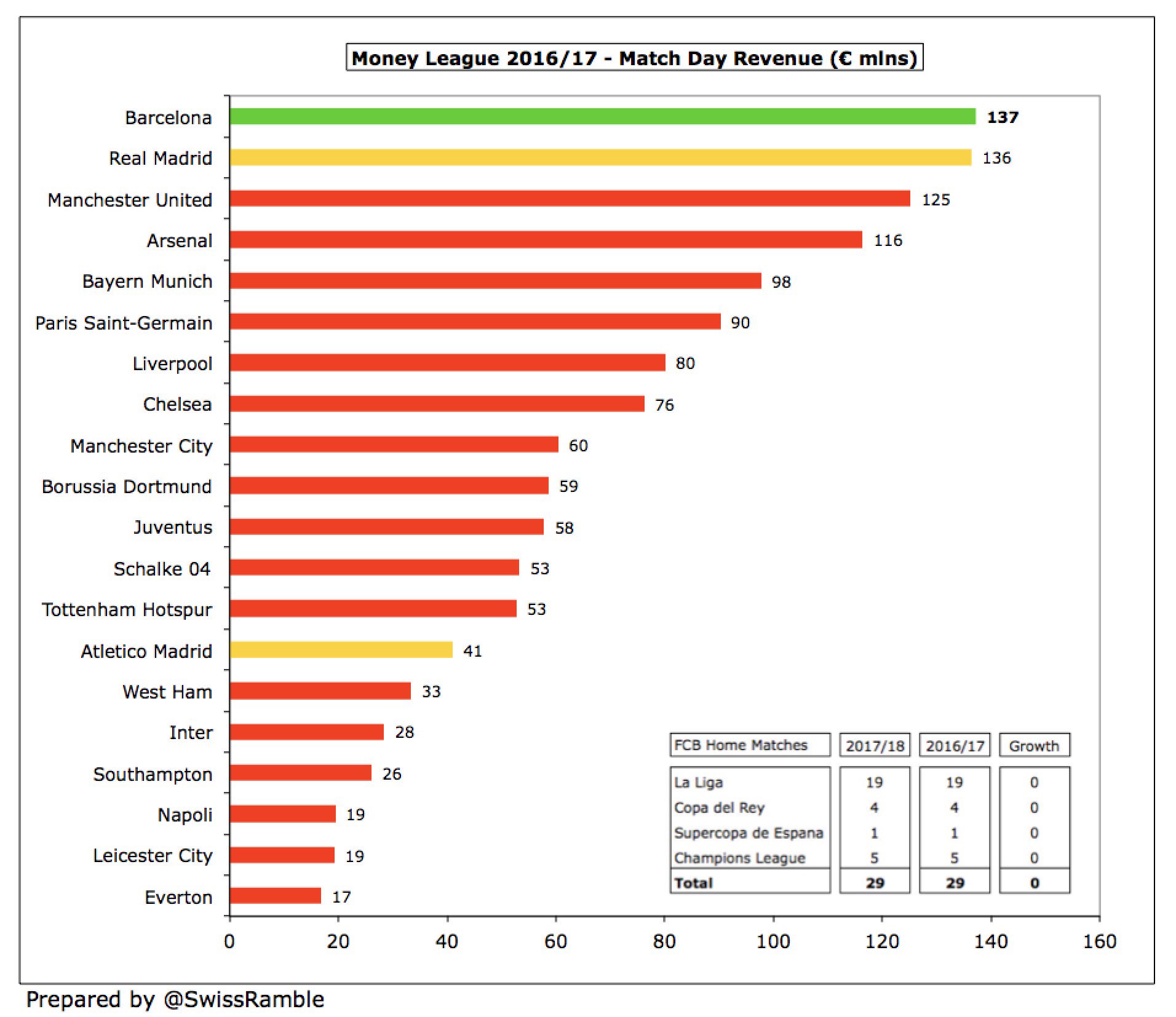 למרות זאת, ברצלונה עשויה לחזור למקום השני מבחינת הכנסות עולמיות, כאשר דלויט יפרסמו את הדו"חות של שאר המועדונים לעונת 2017/18: ההכנסות של 690 מ' אירו של ברצלונה גבוהות יותר מההערכה של מנצ'סטר יונייטד (673 מ' אירו, שזה 590 מ' פאונד כפול שער של 1.14) – אם כי יש לזכור שהרבה תלוי בשער שישתמשו בו בדו"ח.