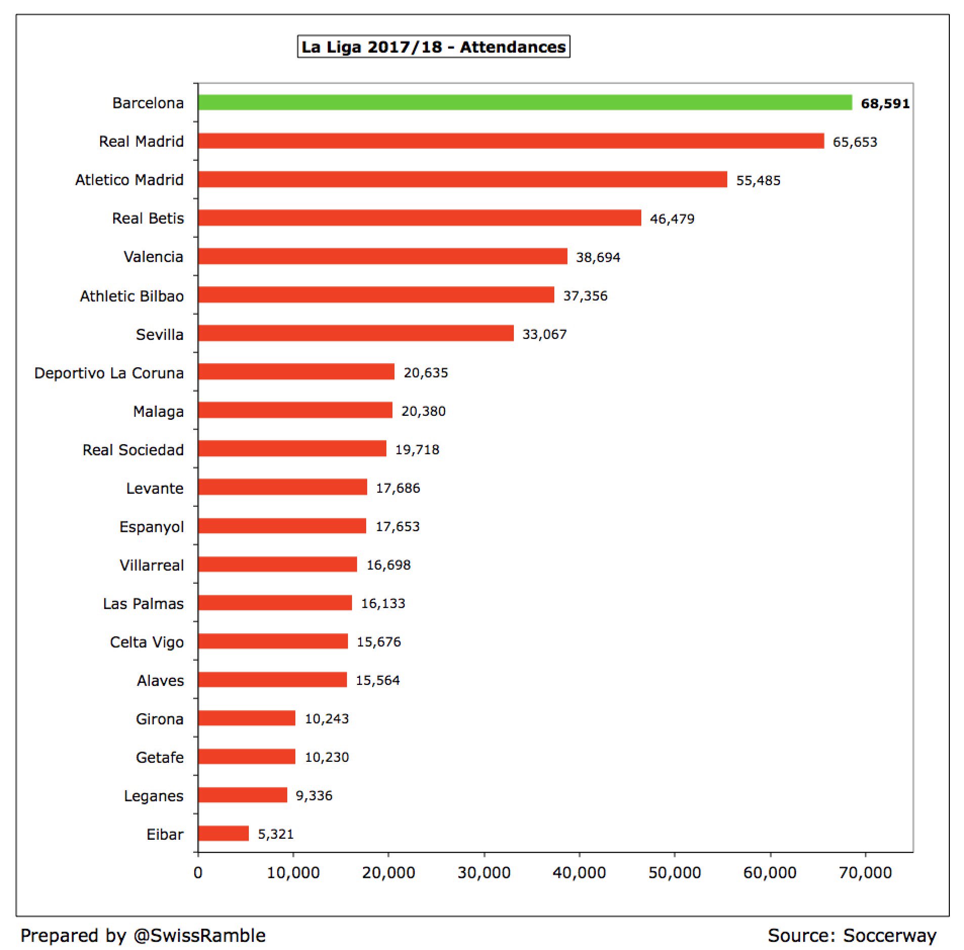 הנוכחות הממוצעת בקאמפ נואו ירדה ב-12%, מ-77,697 צופים ל-68,591 בעונת 2017/18, אם כי זה עדיין המספר הגבוה ביותר בספרד, מעל ה-65,653 של ריאל מדריד. אתלטיקו מדריד עלתה ל-55,475 צופים בממוצע בעקבות המעבר שלהם לוונדה מטרופוליטנו.