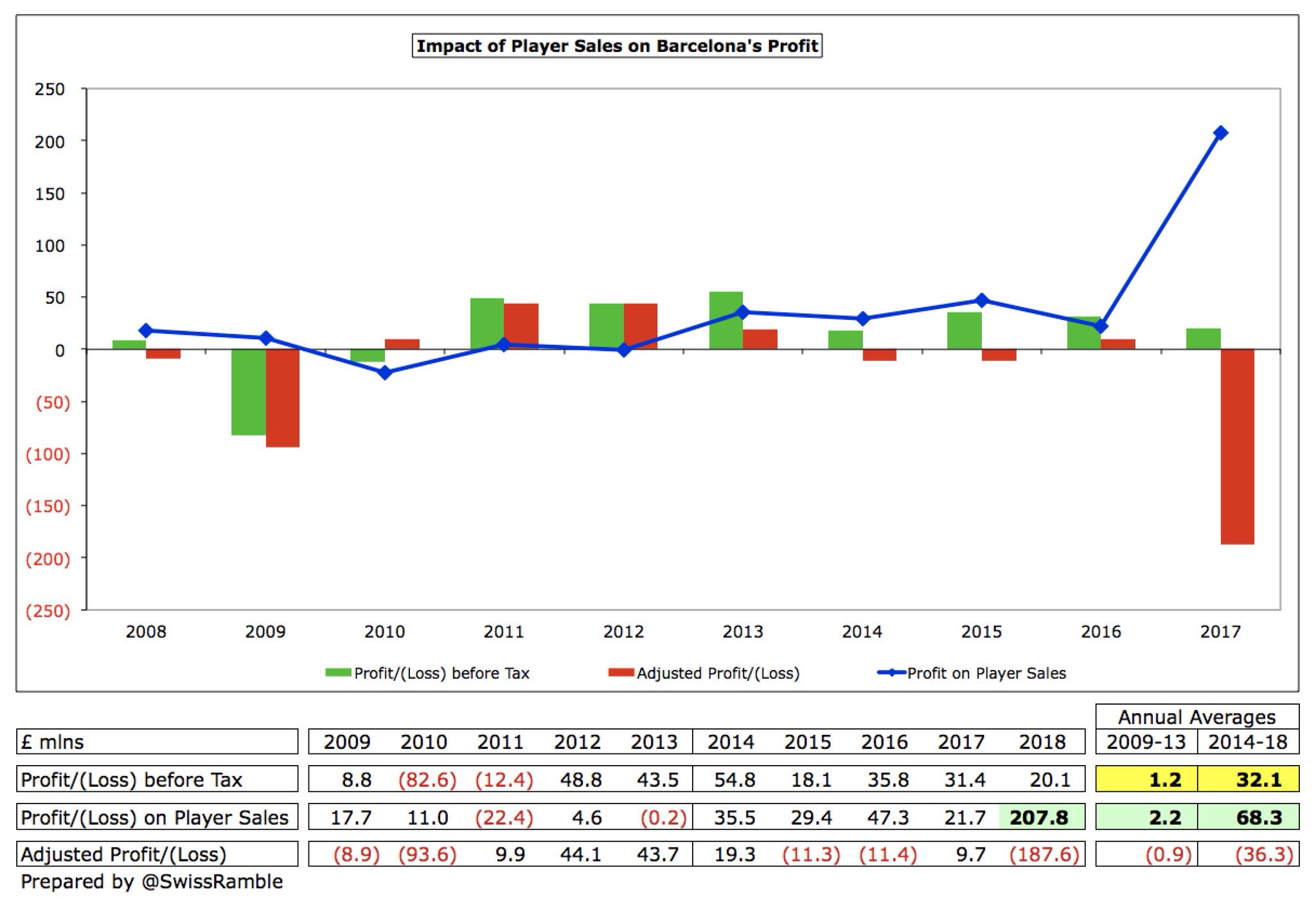 עונת 2017/18 הייתה ללא ספק יוצאת דופן עבור ברצלונה בשוק ההעברות – גם בתחום הרכישות (344 מיליון אירו) וגם המכירות (233 מ'). עונת 2018/19 עד כה נראית הרבה יותר נורמלית ביחס לשנים הקודמות – 126 מ' רכישות, 82 מ' מכירות. אף על פי כן, ההפסד הממוצע נטו עלה ב-80% במשך 3 העונות האחרונות, עד 82 מ'.