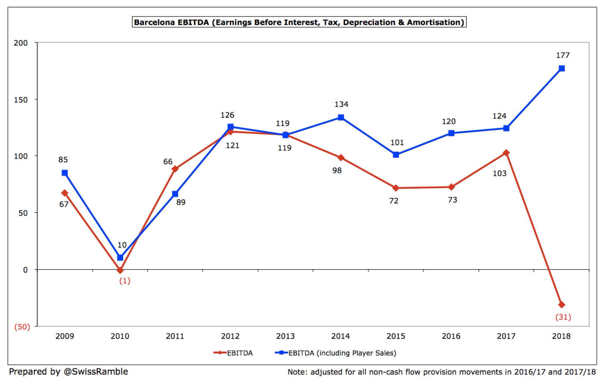 מדד EBITDA (רווח לפני ריבית מסים פחת והפחתות), בהתחשב בהכנסות מפעילות במזומן, עלה מ-124 מיליון אירו לסכום שיא של 177 מ'. אף על יפי כן, אם לא כוללים מכירות שחקנים, המדד התרסק מ-103 מ' למינוס 31 מ'. בתקציב לעונת 2018/19 ה-EBITDA הצפוי הוא 191 מ' (106 מ' אם לא מחשיבים הכנסות ממכירות שחקנים).
