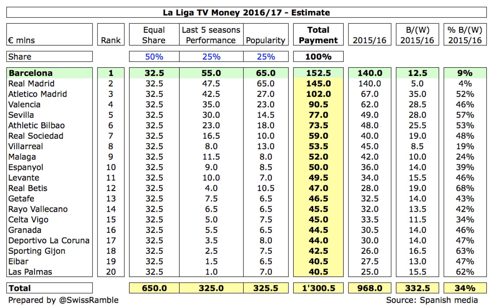 דרך אחרת להסתכל על זה, ההכנסות המשותפות של ריאל מדריד וברצלונה, 1.44 מיליארד אירו (750 מ' של ריאל מדריד ועוד 690 מ' של ברצלונה), הוא כמעט כמו ההכנסות של כל יתר 18 קבוצות הליגה הספרדית ביחד (1.45 מיליארד).