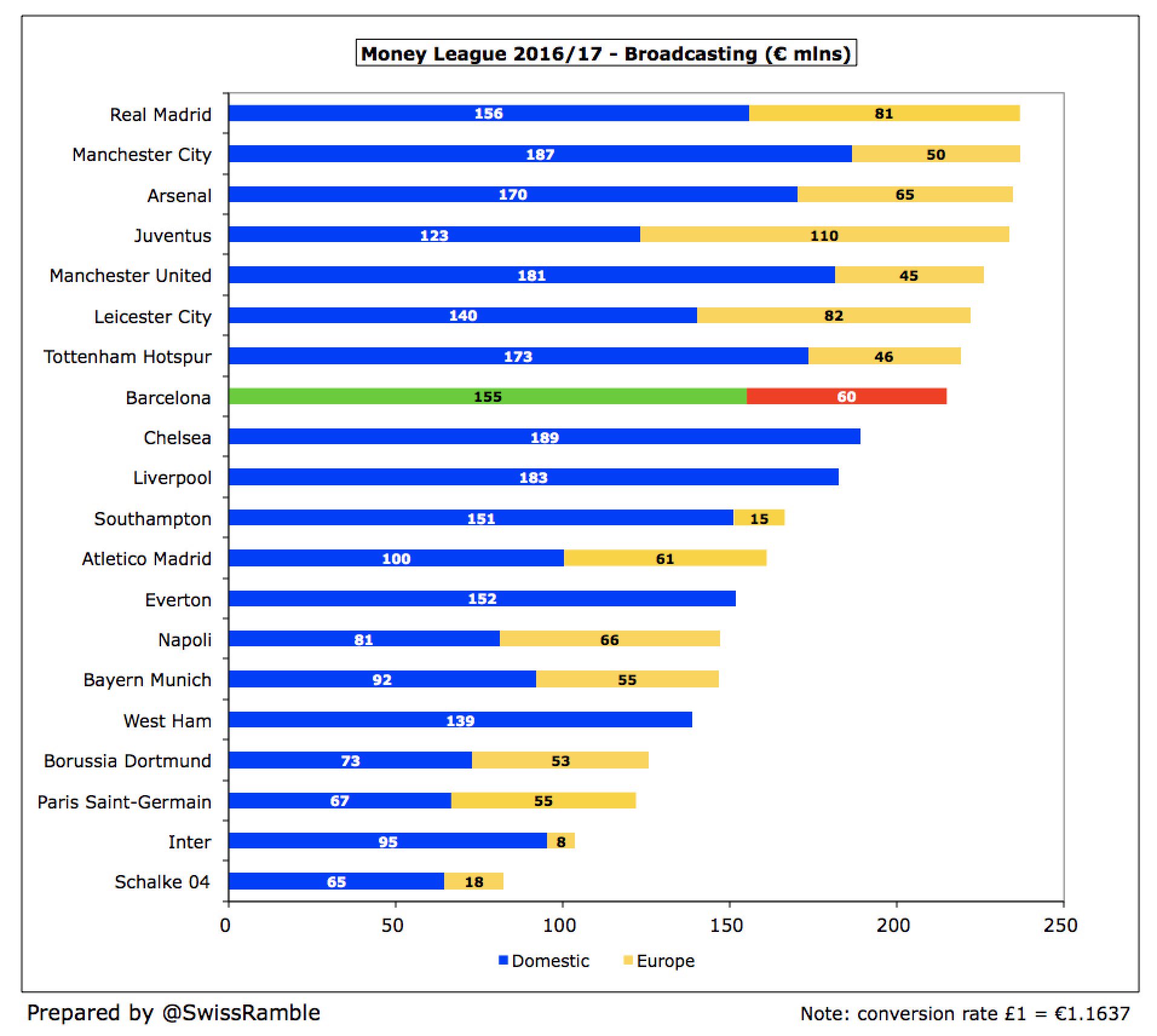 הסכום שהכניסה ברצלונה מזכויות שידור בעונת 2016/17 הוא השמיני בגובהו באירופה, עם 215 מיליון אירו – 22 מ' מתחת לריאל מדריד עם 237 מ'. ההבדל היה כמעט כולו בגלל הזכייה בליגת האלופות: ריאל מדריד הכניסה 81 מ' על זכייתה בגמר, ברצלונה 60 מ' על הגעתה לרבע הגמר.