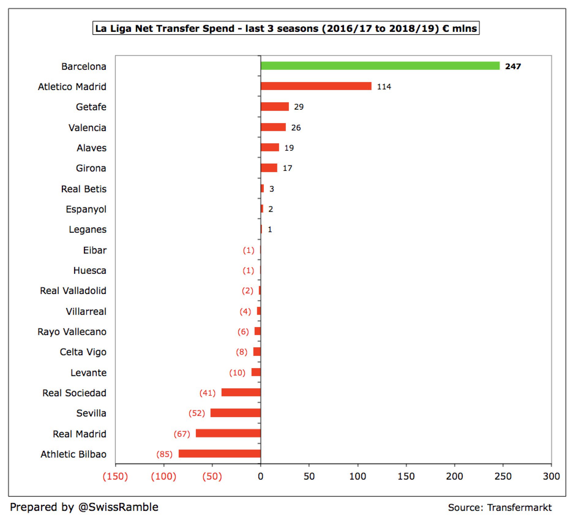כתוצאה מכך, ההפסד נטו של ברצלונה מהעברות סכנים ב-3 העונות האחרונות, 247 מיליון אירו, הוא הגבוה ביותר בליגה הספרדית. יותר מכפול מאשר אתלטיקו מדריד – 114 מ'. להבדיל אלף הבדלות, ריאל מדריד הרוויחה 67 מ' במהלך התקופה הזו.