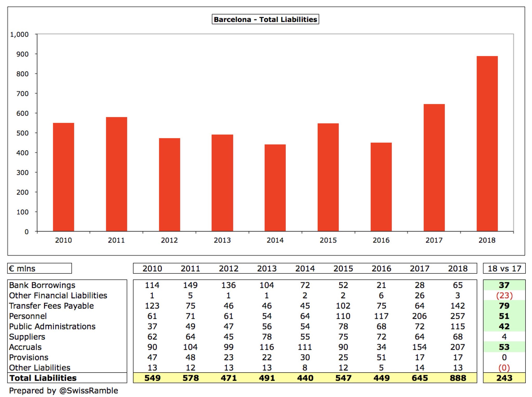 בהתחשב בהגדרה הרחבה ביותר של התחייבויות, לברצלונה יש סך התחייבויות של 888 מיליון אירו ב-2018 – עלייה של 243 מ' ביחס ל-645 מ' בשנה הקודמת. בנוסף להלוואות מהבנק ודמי העברה, יש גם עלייה גדולה בחובות לאנשי צוות (51 מ') ולמינהל הציבורי (42 מ').
