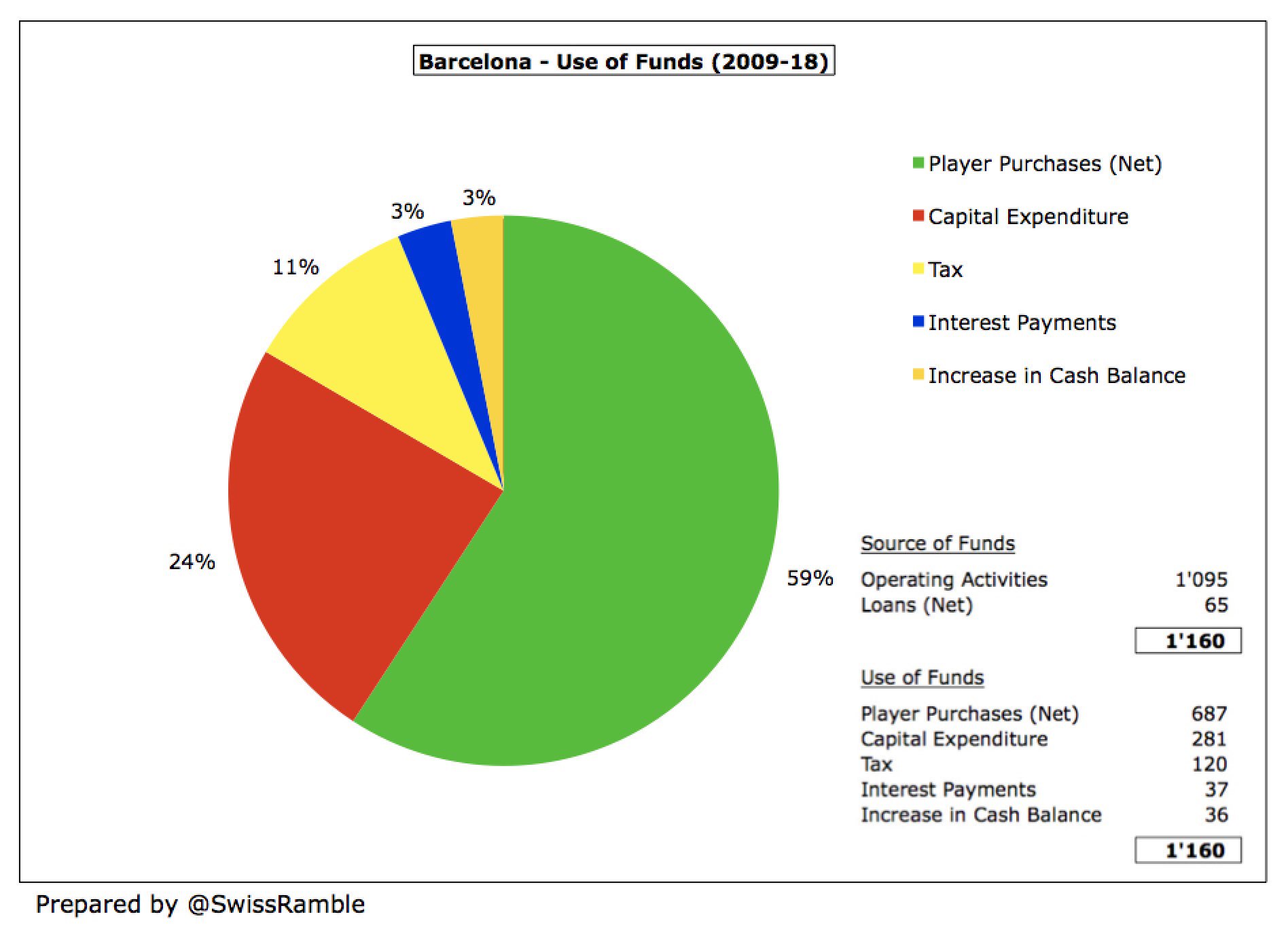 מאז 2009, ברצלונה השתמשה ב-60% מהמזומן הזמין שלה על רכישות (נטו) של שחקנים, אך היא גם השקיעה 281 מיליון אירו באספאי בארסה (המיזם של שדרוג האצטדיון) ובשיפורים של האצטדיון. בנוסף, המועדון הוציא 120 מ' על מס ו-37 מ' על תשלום ריביות, בעוד מאזן המזומן עלה ב-36 מ'.